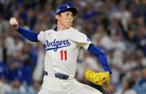 ドジャースの佐々木朗希投手が、4点リードの9回にポストシーズン初登板を果たし、1イニング三者凡退の圧巻投球で試合を締めた。