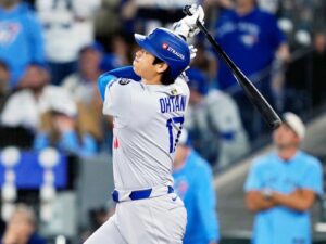 米大リーグのワールドシリーズ第1戦が24日(日本時間25日)、トロントで行われ、ドジャースの大谷翔平(30)が七回の第4打席で右翼席にソロ本塁打を放った。打球はバットの先端に当たったような鈍い音を響かせたが、強い打球速度と打球角度でスタンドに届いた。試合はブルージェイズが11―4で快勝し、シリーズ初戦を制した。