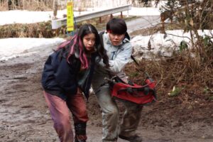 あわせて公開された場面写真には、泥まみれになり負傷した耳に包帯を巻く小山内(鈴木福)が、前へ進む若林(円井わん)を支える緊迫のシーンのほか、猟師・神崎(宇梶剛士)と若林の固い握手、そして横転した軽トラック上で雄叫びを上げるヒグマの姿など、作品の張りつめた世界観が強く反映されたカットが並ぶ。