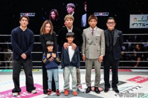 リング上には、現在UFCに参戦する朝倉海選手、盟友・所英男選手、そして家族の姿があった。花束を受け取りながら、金原はこう続けた。