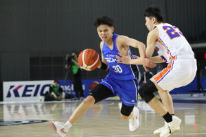 第2クォーターに入ると立川ダイスU15が反撃。野呂田桜輔、石毛煌明らのアウトサイドシュートが次々と決まり、一時は4点差まで詰め寄られる。京都精華学園は岡修平がインサイドで踏ん張り、リードを死守したものの、前半は緊張感の漂う展開で折り返した。