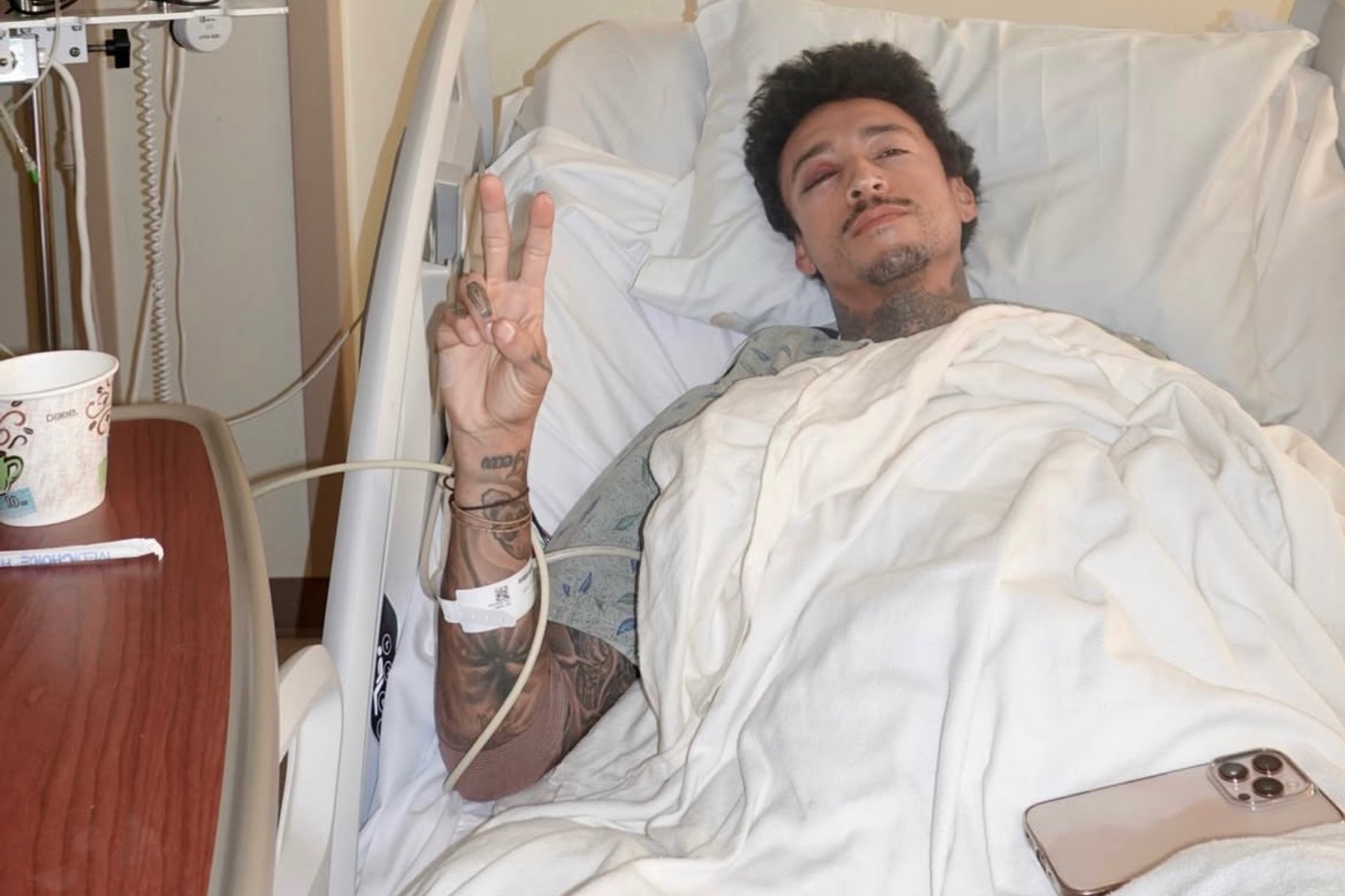 投稿には、病院のベッドで横たわりながらピースサインを見せる写真や、