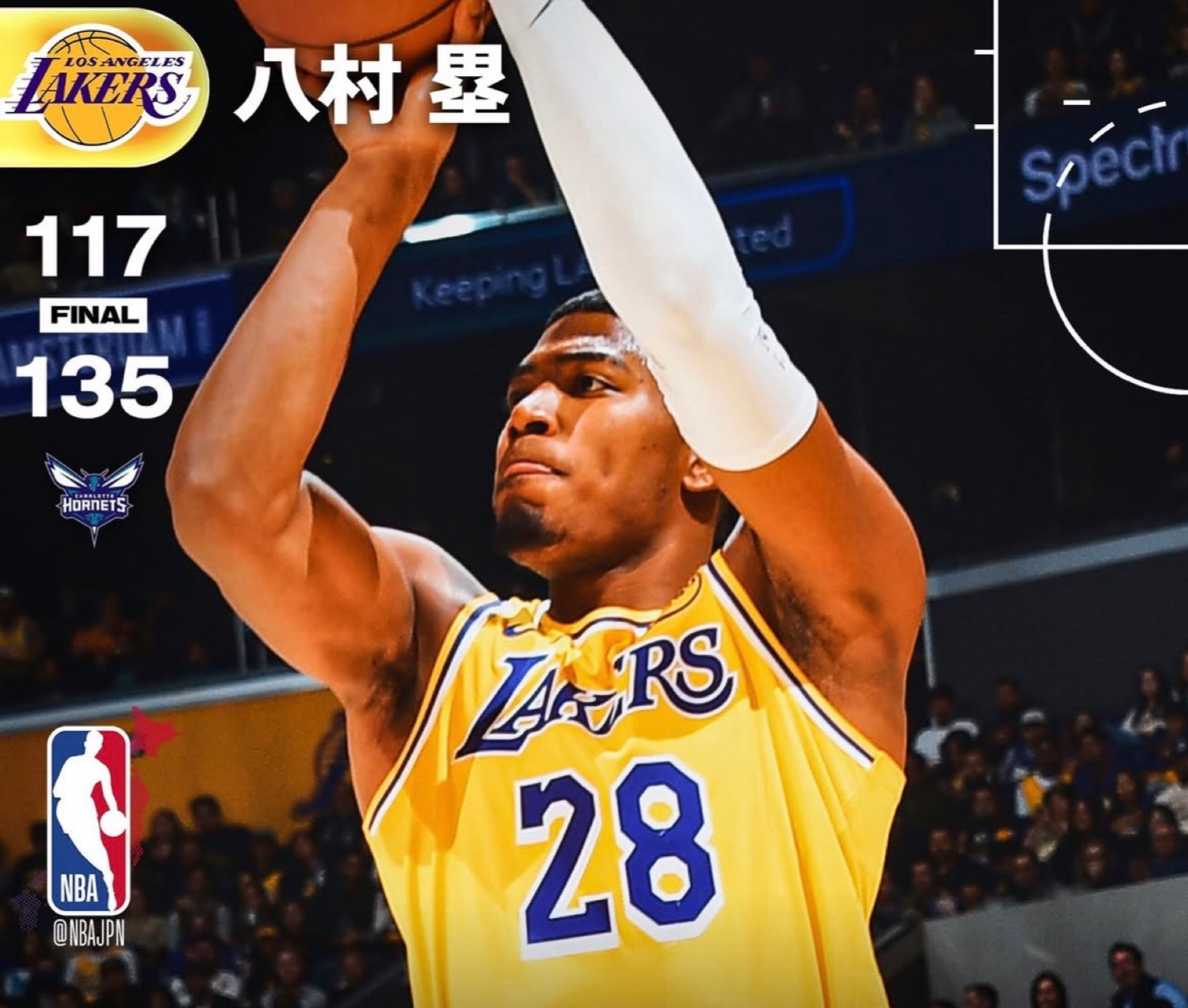 NBAは1月15日(日本時間16日)、各地で試合が行われ、レーカーズの八村塁は本拠地ロサンゼルスでのホーネッツ戦に途中出場した。プレータイムは17分39秒と限られた中で3得点、1リバウンドを記録。チームは117―135で敗れ、今季成績を24勝15敗とした。