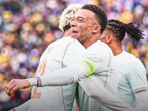前半32分、高い位置でボールを奪うと、デンベレのスルーパスに抜け出したエンバペが冷静なループシュートを決め、フランスが先手を奪う。