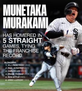 村上宗隆選手がメジャーの舞台で歴史的なインパクトを刻んだ。ホワイトソックスの主砲は22日(日本時間23日)、敵地でのダイヤモンドバックス戦に「3番・一塁」で先発出場。7回の第4打席で10号本塁打を放ち、日本人選手としては大谷翔平選手に続く史上2人目の5試合連続本塁打を達成した。