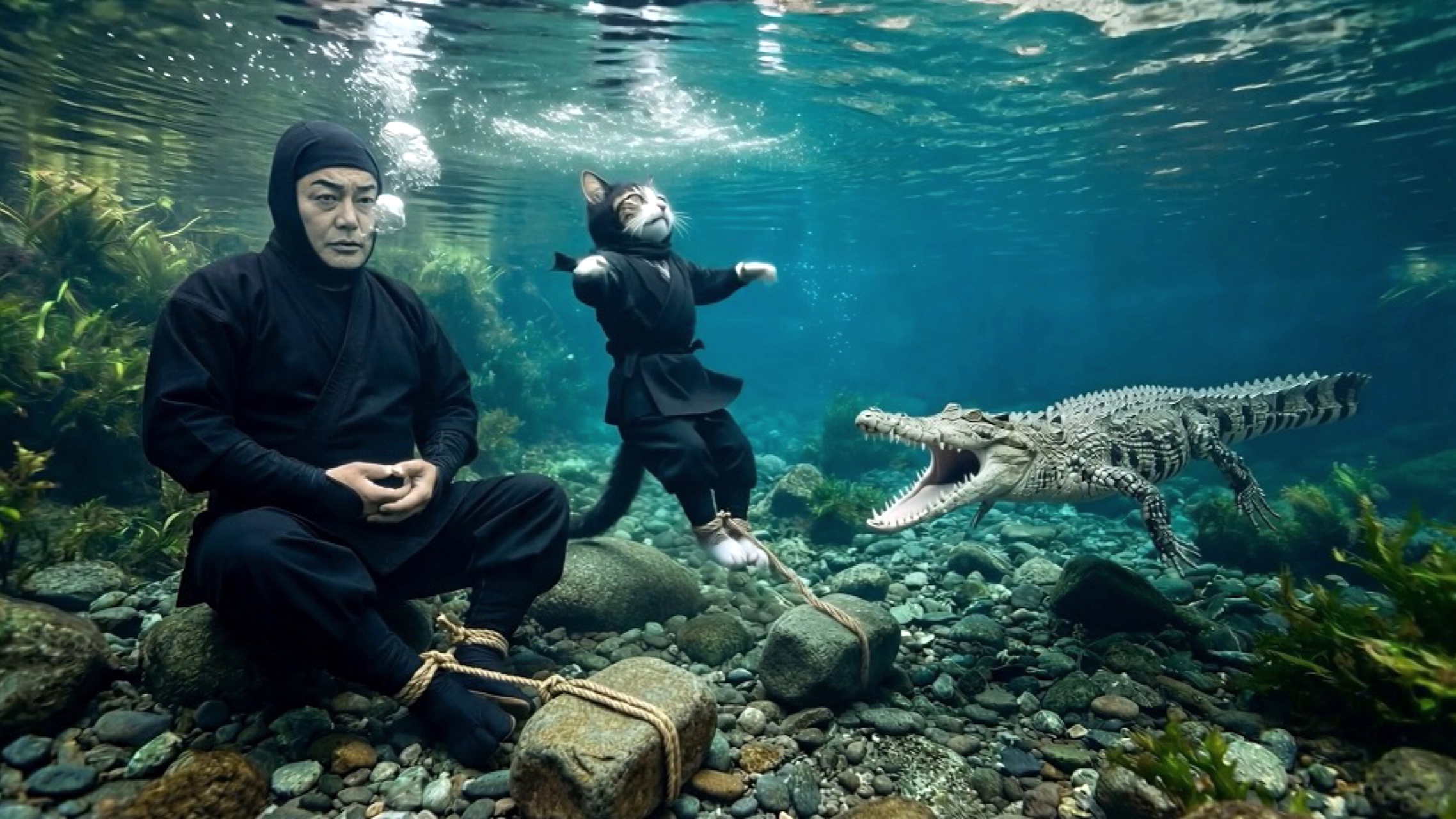 巨大なワニが潜む水中での精神統一、